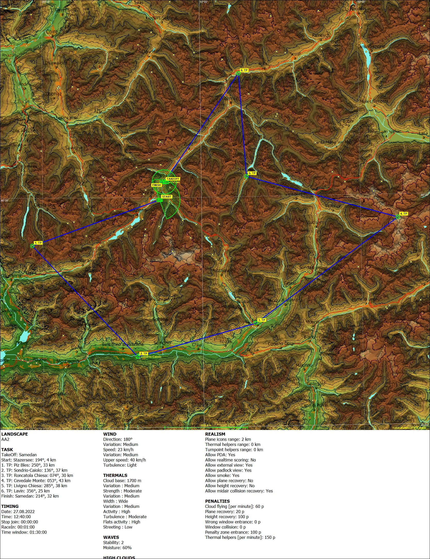 Альпы. Стандартный класс планеров. Дистанция 237 км. Южный ветер силой более 20 к/час. Высокая активность возникновения широких термиков. В потоках умеренная болтанка. Средняя изменчивость параметров погоды. Температура 20 гр. Рельеф - горы высотой 2500 - 3500 м. Хорошие условия для формирования высоких волновых потоков. Сильный сдвиг ветра по скорости (до 40 к/час) на высотах выше слоя инверсии.
