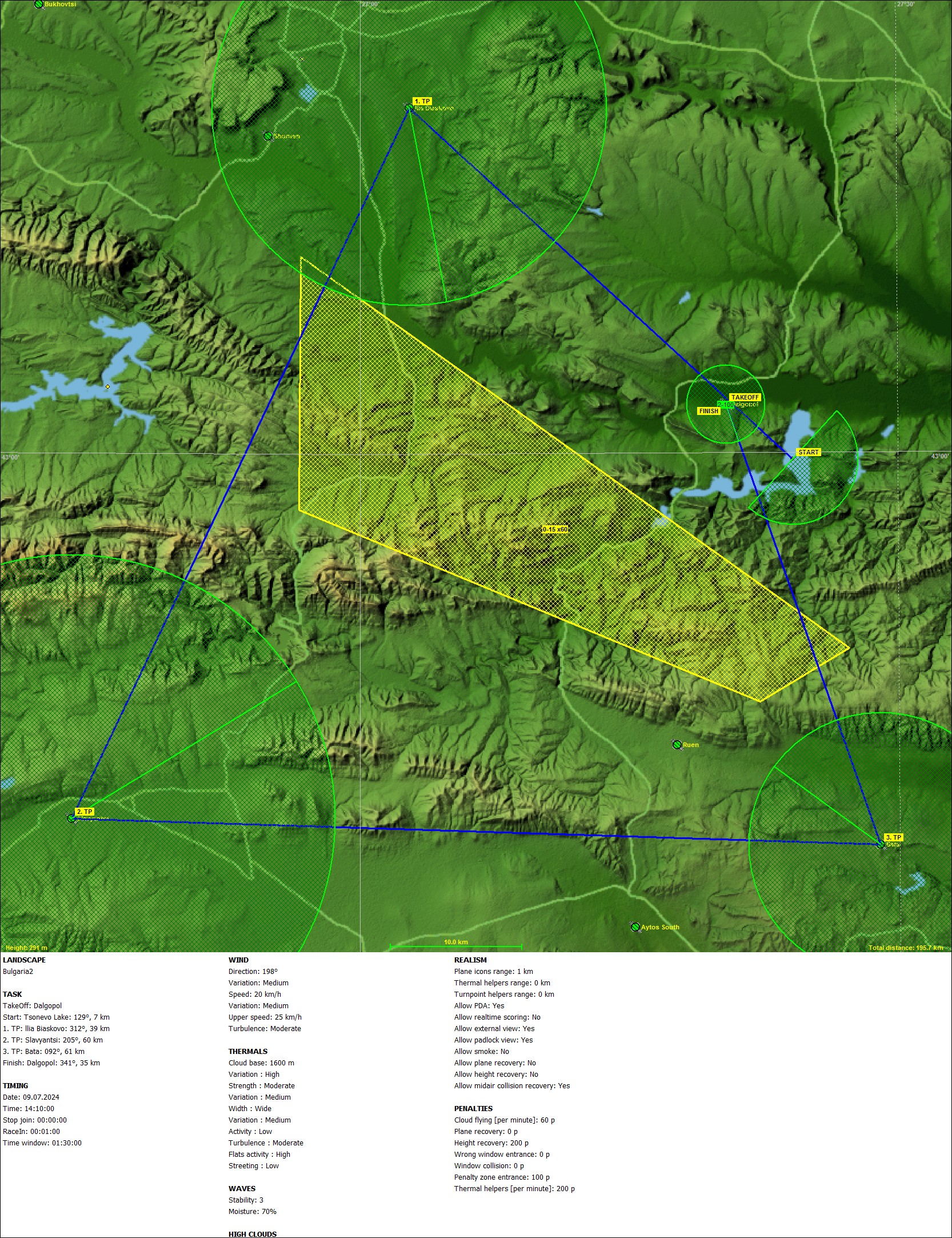 Болгария. Задание типа ААТ на 105 минут для планеров 20-ти метрового класса. Три назначенные области радиусом 15, 20 и 10 км.