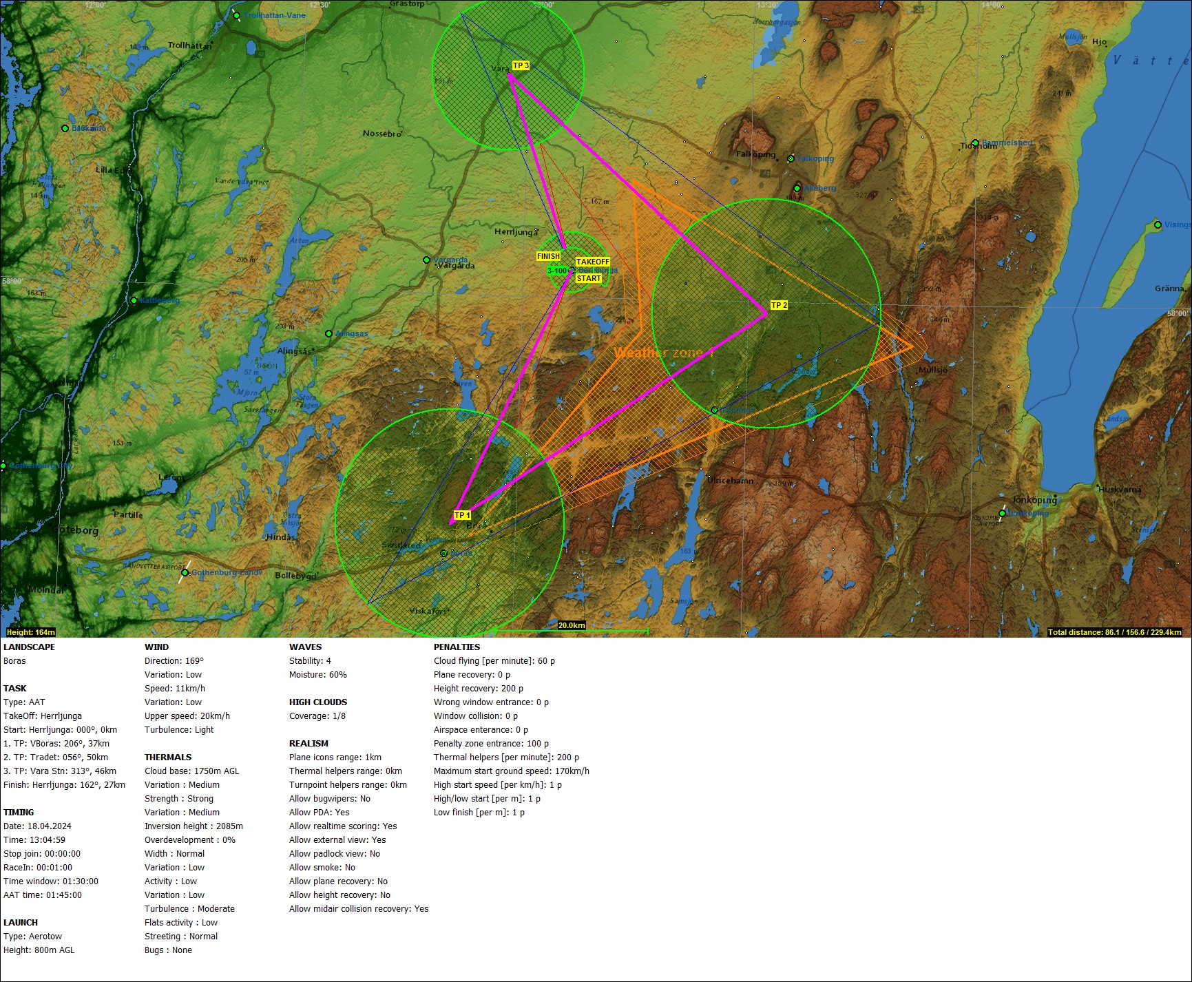 Швеция. Весна. Клубный класс. ААТ на 105 мин. Три зоны радиусом 15, 15 и 10 км. Дистанция: мини 86, миди 157, макси 229 км. Высота старта без ограничений. Скорость на старте не более 170 км/ч. Финиш 300 м.