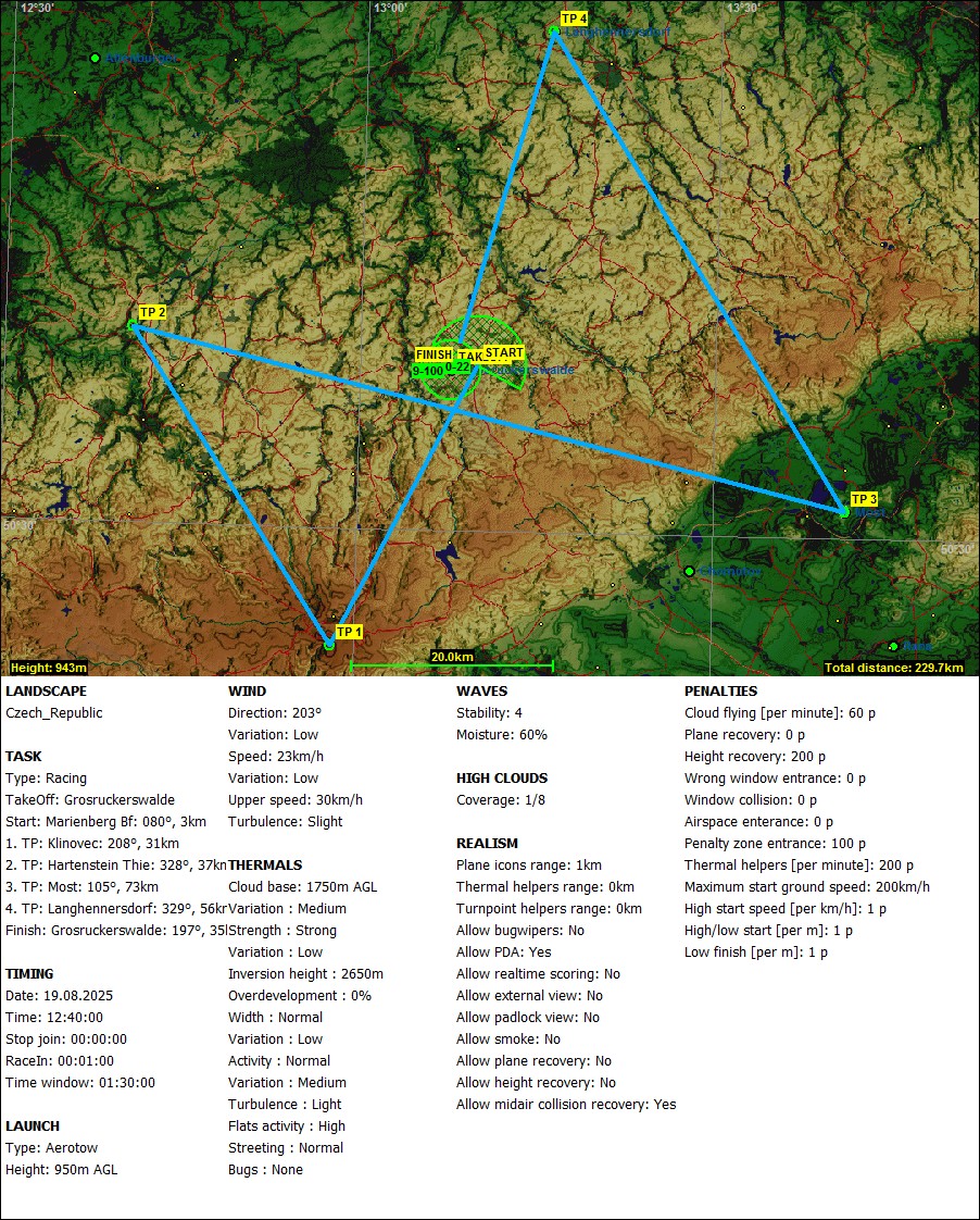 Чехия. Лето. Задание для стандартного класса. Гонка. Высота старта 2200 м. Финиш 900 м. Ветер с юго-запада. Нормальная термическая активность. Потоки средней силы и ширины. В воздухе слабая турбулентность. Есть облачность верхнего яруса. Температура у земли 27 градусов. Запретов нет. Задание умеренной сложности.