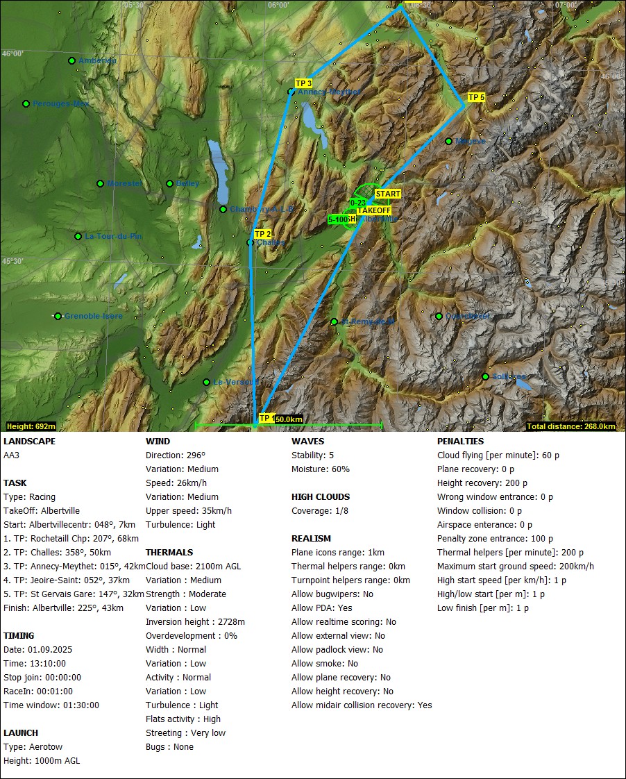 Альпы. Осень. Задание для 20-ти метрового класса. Гонка. Дистанция 268 км. Высота старта 2300 м. Финиш 500 м. Северо-западный ветер. Нормальная термическая активность. Потоки средней силы. Есть небольшое количество облаков верхнего яруса. Температура 22 градуса.