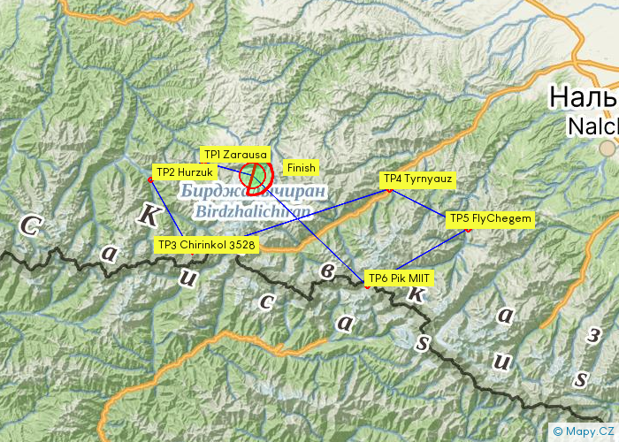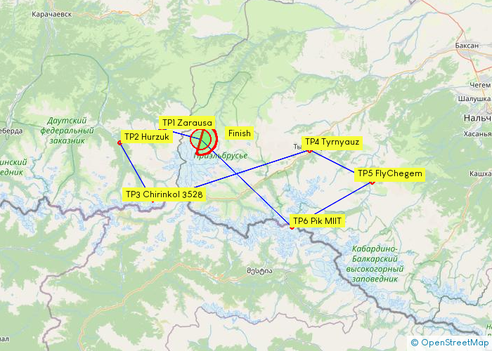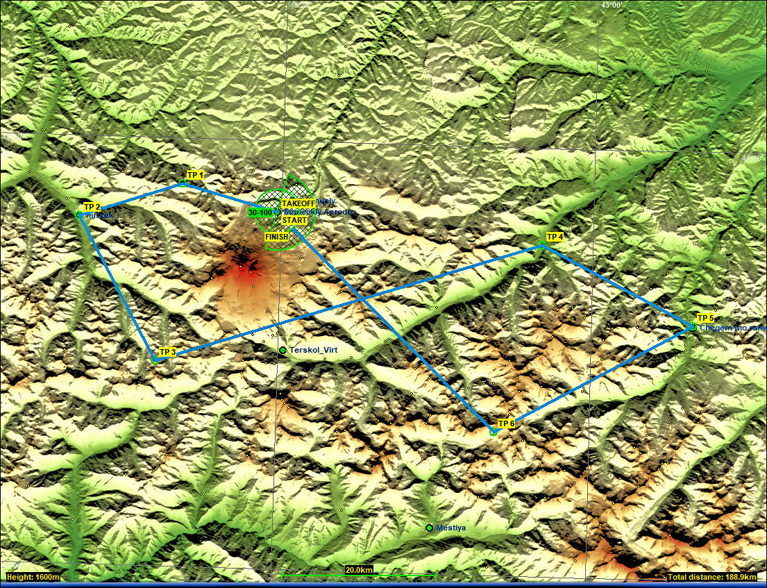Высокая база до 5000MSL позволяет довольно комфортно путешествовать над суровыми вершинами и грядами. Плотный западный, юго-западный ветер хорошо сотрудничает с ландшафтом. Финишный глайд проходит над платовым подножьем Эльбруса и требует тщательного соблюдения высотного режима.